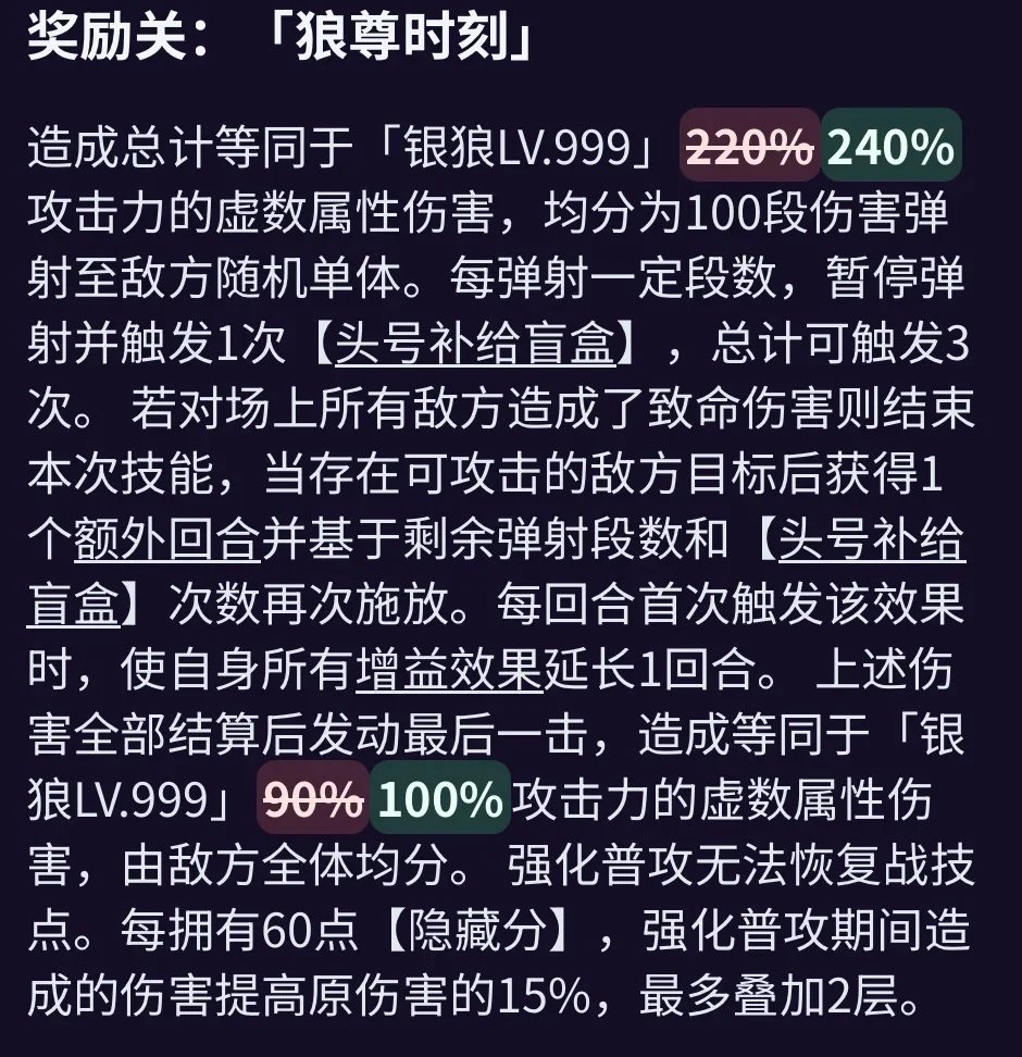 【頭號補給盲盒】造成的歡愉傷害增笑40%。敵方目標進入戰鬥時,會被植入【禁限弱點】:擁有全屬性弱點並且全屬性基礎抗性降低至0(若基礎抗性爲0則改爲對應屬性抗性降低20%)。
