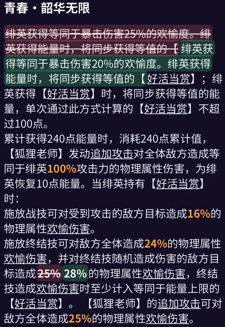 暴擊傷害提高36%,【狐狸老師】施放攻擊後會額外觸發一次歡愉技。歡愉技會使自身額外獲得10點【好活當賞】。