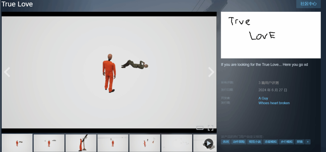 先給大家算筆賬,這款《True Love》國區定價3600元,換算成美區是680美元,放眼整個Steam平臺,就算是3A大作的終極典藏版,也達不到這個價位。更離譜的是它的簡介,只有短短一句話:“如果你在尋找真愛,那麼它就在這裏。”沒有劇情介紹,沒有玩法說明,甚至連開發商信息都模糊不清,典型的“神祕兮兮”套路。