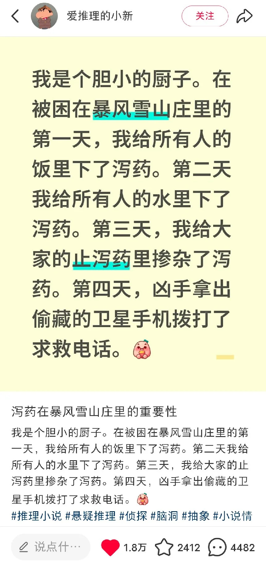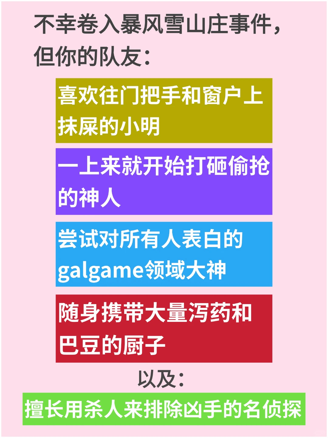 瞬间,温馨的围炉夜谈没有了,取而代之的是一个个夹紧屁股排队上厕所的诡异景象。至此,暴风“雪”山庄,成为了暴风雪山庄故事里最高的山、最长的河。而与之相关的推理段子,也如一匹脱缰野马,朝着奇怪又诡异的方向头也不回的狂奔。很快,又相继出现了暴风雪山庄欲望版、Galgame版、黑暗森林版……