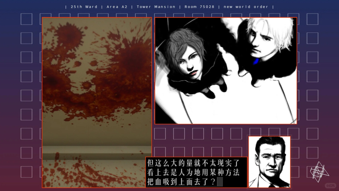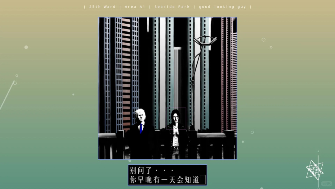 至于游戏里语句跃出如同打字机般的设计、模拟弹窗式的图片插入效果,背景中以相同规律不断闪动的几何图案与波浪线条,则有着另一部同样经典的古早硬汉推理游戏,《银色事件》的影子。