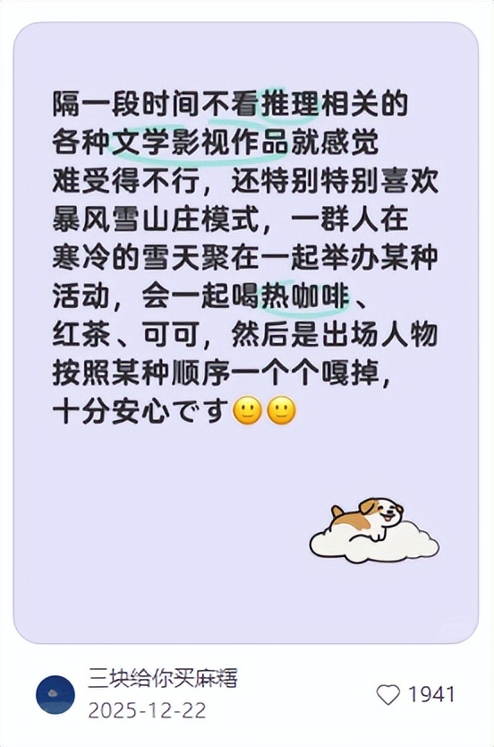 先是有人迷恋上了这种大雪天一群人围坐在暖炉旁谈天说地,突然跟外界断联,凶手大开杀戒,最后死得死、死得死的安心感。