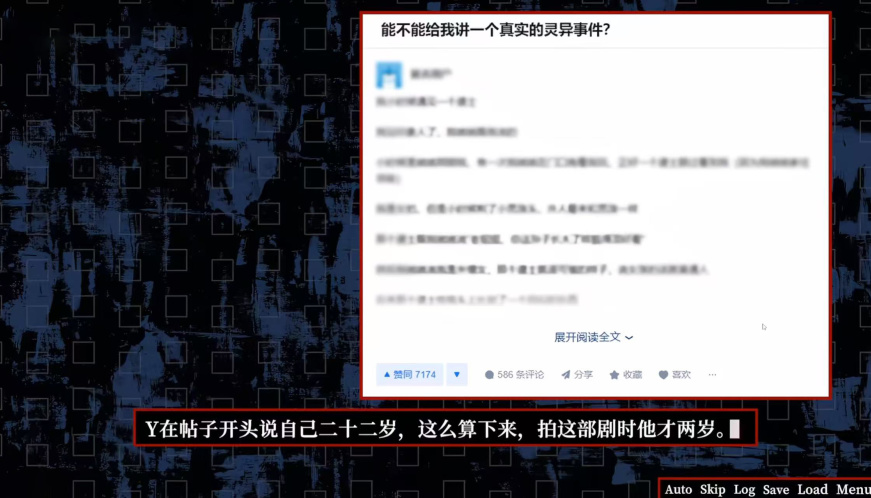 故事揪住一篇看上去讲小时候玩木头人游戏,数数抓人的孩子能从不可思议的死角看到“我”的这个细节分析了很久,进而让玩家猜测,这或许是导致“我”讨厌背后有人靠近的原因。