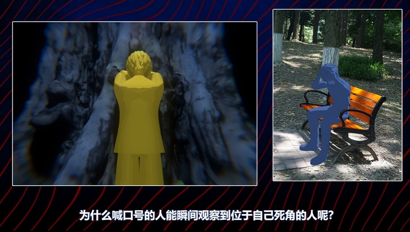 两者同样借虚拟感十足的剪影,与写实场景、部分鬼怪的真人图片之间形成的反差,放大恐怖谷效应,无意中营造了一种诡异与不安感。