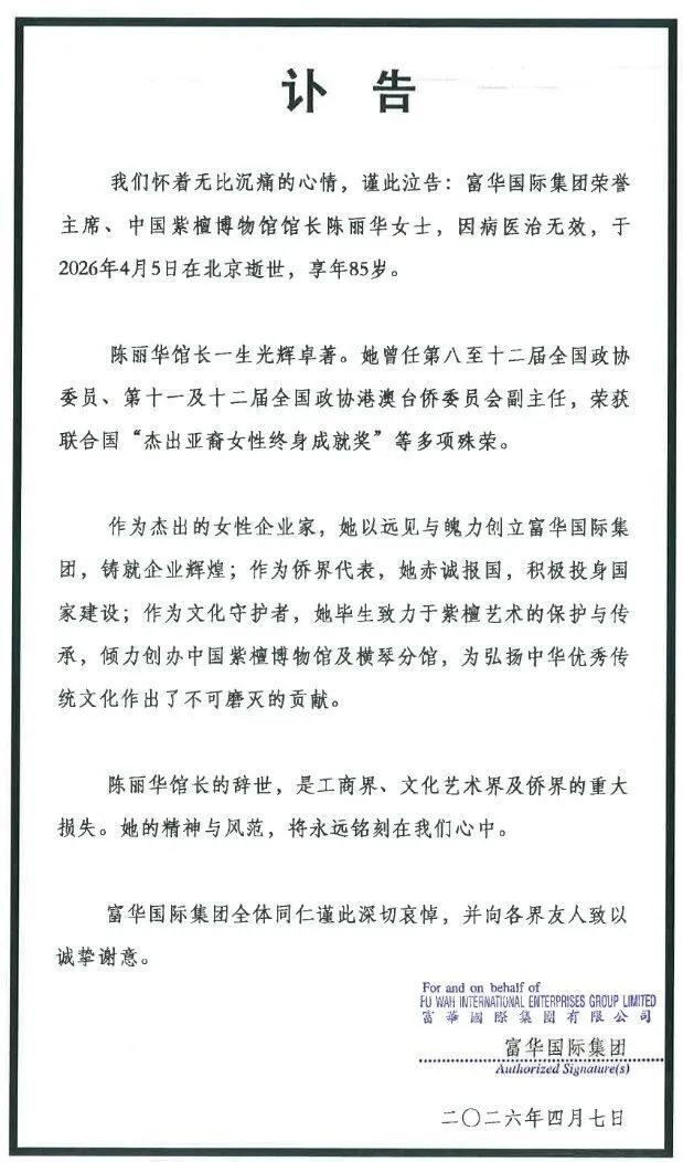 2026年4月7日,富华国际集团发布讣告,集团荣誉主席、中国紫檀博物馆馆长陈丽华女士,因病医治无效,于4月5日在北京逝世,享年85岁。
