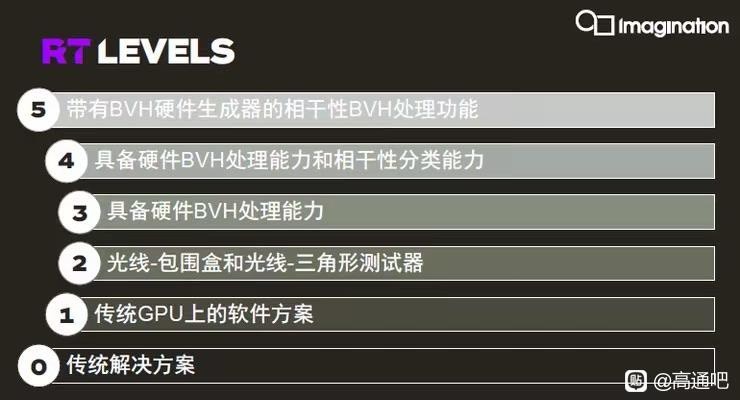 那么今晚聊什么?聊硬件光追(Hardware Ray Tracing),硬件光追我就不用多说了吧,相信大家都懂,我们具体说说RT的实现。我记得应该是21年那阵,IMG CXT在发布的时候提出了一个很新颖的观点,那就是RTLS(RT LEVELS)从0到5一共6级,如图所示,当时只有桌面端的NVIDIA和AMD才支持比较初级的达到2和3级的光追(NVIDIA好歹有硬件BVH,算3级,AMD没有,只算2级),而移动端没人支持硬件光追,基本都是1级的软件光追,而这时候,IMG推出的CXT直接支持了4级的光追,其不仅拥有硬件BVH,还能够用其处理相干性分类。可惜理想是美好的,现实是残酷的,没有人用。(虽然Tensor G5用了DXT,但是也没装RT Core啊,只有可怜的RT 0.5……,Tensor G6更幽默,退回了CXTP,虽然我并不清楚哪来的CXTP,我只知道有DXTP),很快到了下一年,NVIDIA的Ada Lovelace升级了RT-Core,加入了Shader Execution Reordering(SER),可以动态组织、重排 shading workload。很显然,在22年,NVIDIA首先支持了4级的RT,**AMD的RDNA3却依旧只支持2级的RT(RDNA2/3的描述是shader-based tr**ersal and intersection accelerator。这说明遍历主体仍偏 shader-side,硬件更像 intersection accelerator,所以是2级)到了RDNA4才有了硬件BVH(BVH8、hardware instance transform、ray hardware stack management acceleration这类更强的 RT 专项硬件特征),达到了3级。intel Arc/Xe-HPG相当激进,RTU带有硬件BVH,且拥有TSU (thread sorting unit),能sort and re-emit shader threads to maximize SIMD coherence,还会把 individual rayscoalesce into coherent SIMD groups,是标准的4级光追实现,后来的Xe2/Battlemage也延续了这个设计。