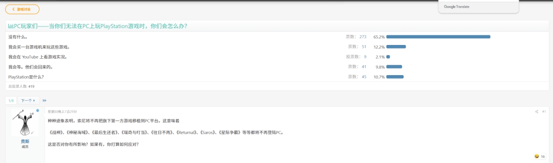 PC 玩家對以後玩不到索尼的獨佔大作是什麼反應?多個論壇帖子和投票顯示,PC 玩家其實並不在意 PlayStation 獨佔遊戲是否登陸 Steam。Steam 本身已經擁有龐大的遊戲庫,索尼不把第一方遊戲帶到這個平臺,對大多數玩家來說可能沒什麼影響。在 NeoGAF 論壇上,一位名叫費斯的用戶詢問電腦玩家,如果不能再在電腦上玩 PlayStation 遊戲會怎麼做,大部分玩家選擇“什麼都不做”,可見這事對他們影響不大。