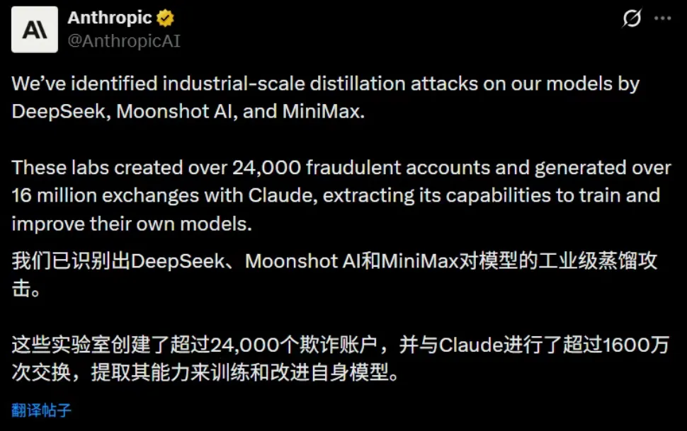 这其中,以 Anthropic 2月那篇长文尤其典型,高调指责DeepSeek、月之暗面、MiniMax 蒸馏 Claude,喊得义正词严。
