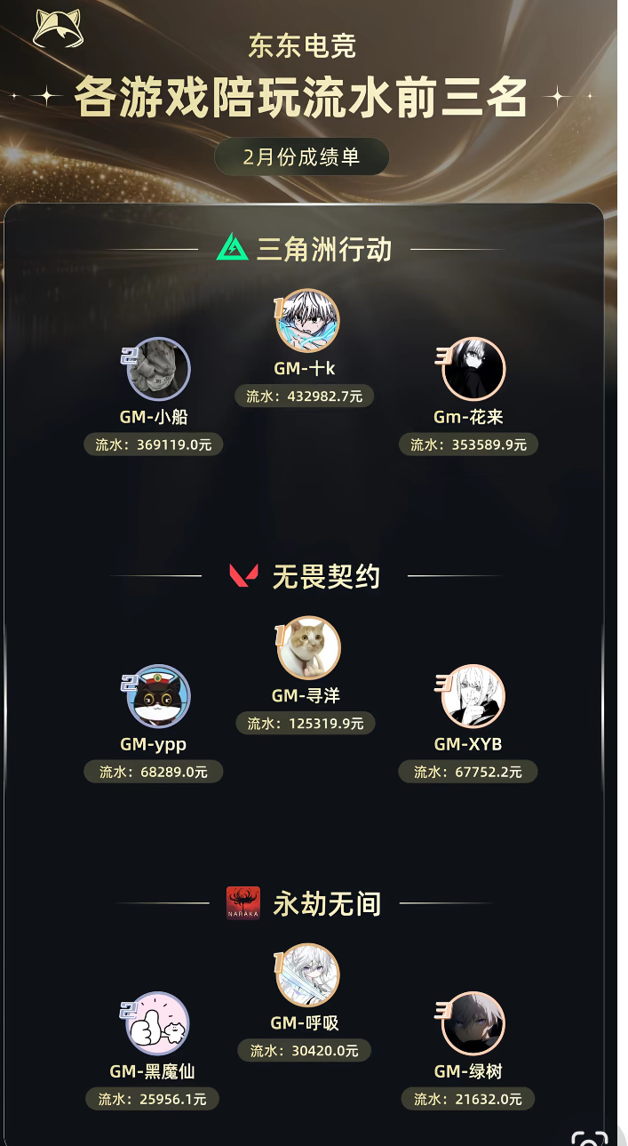 還記得前兩個月看過的東東電競的陪玩流水排行,看看三角洲掙錢這一塊。