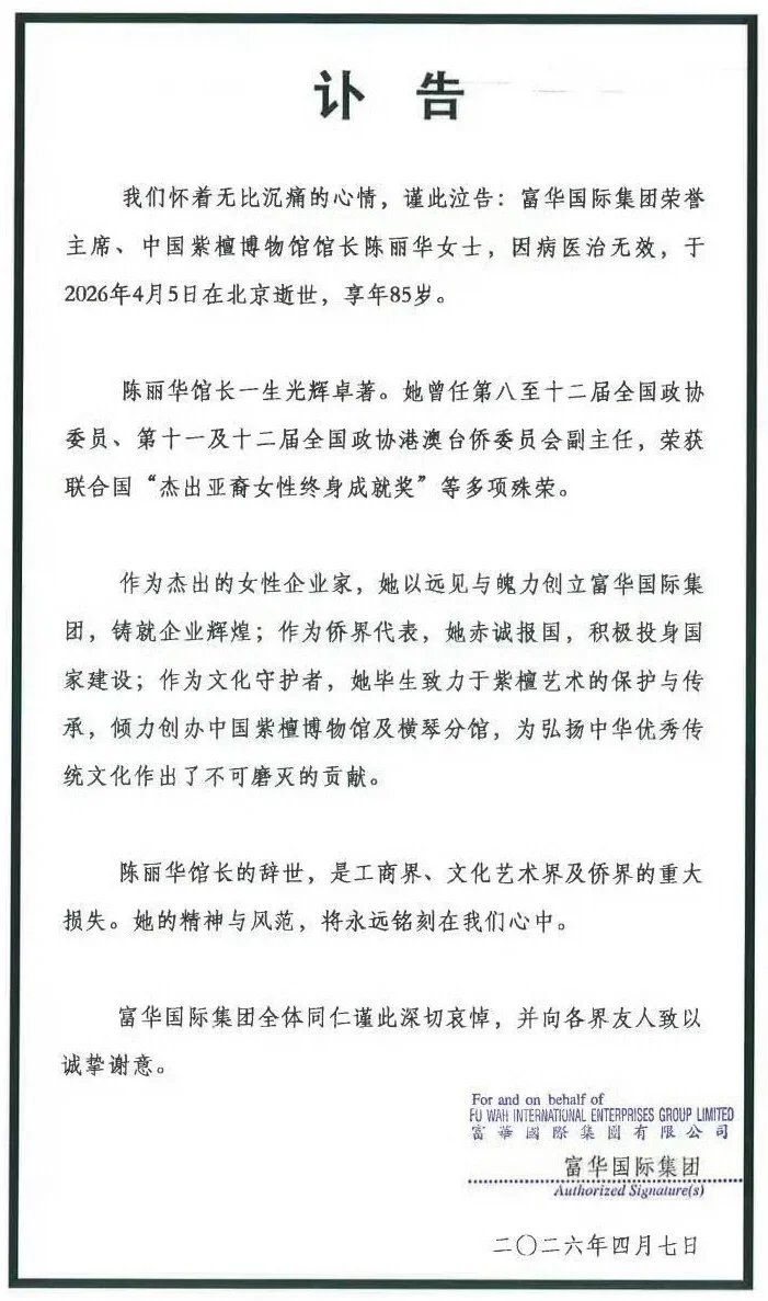 富华国际集团、北京侨商会4月7日联合发布讣告:富华国际集团荣誉主席、中国紫檀博物馆馆长、第八至十二届全国政协委员陈丽华女士,因病医治无效,于2026年4月5日20时50分在北京逝世,享年85岁。