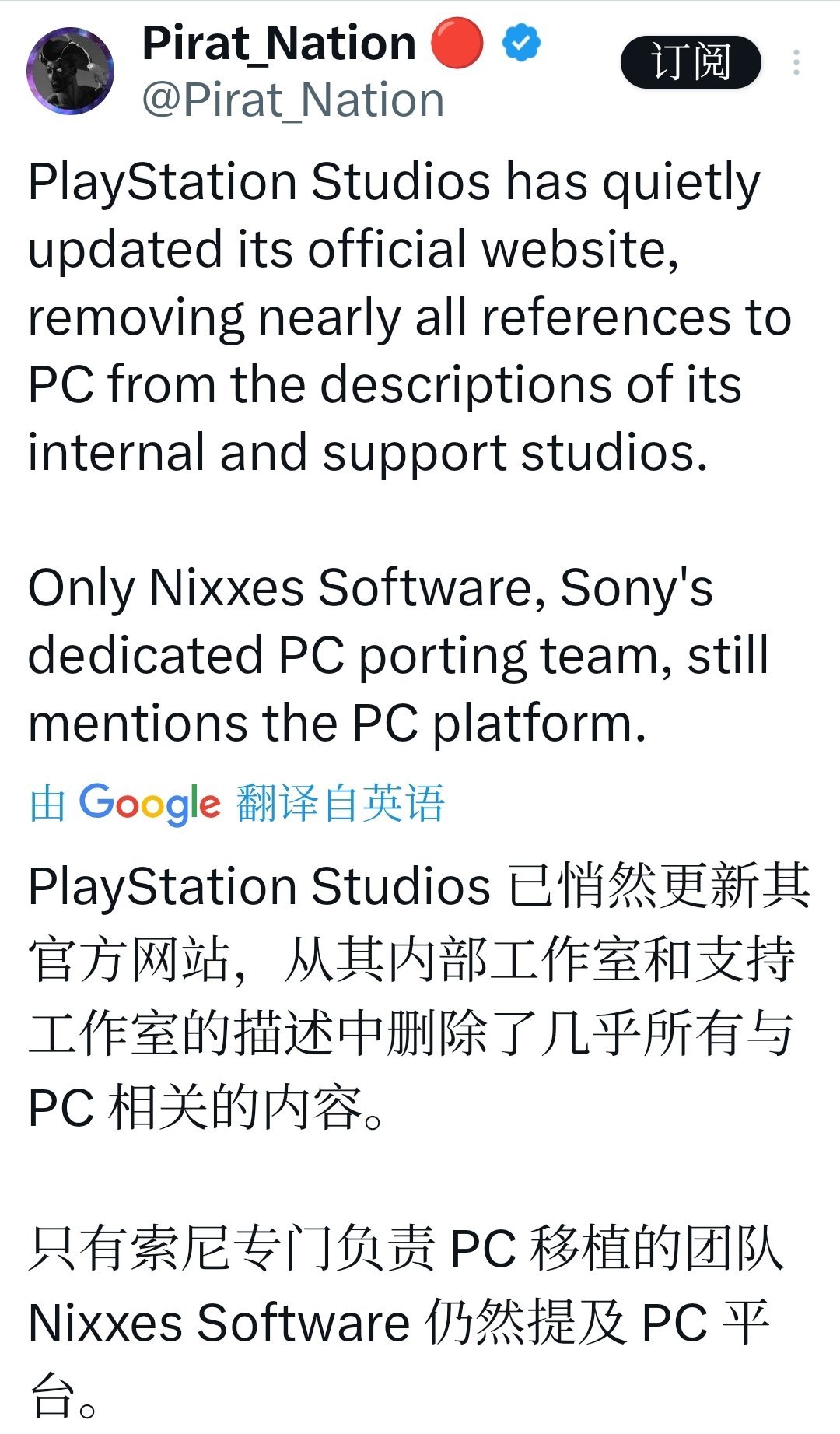 索尼PlayStation工作室簡介刪除了“PC”相關表述,後端系統也移除了跨平臺購買等功能;PC移植工作室Nixxes的定位也更強調“高質量移植能力”但服務型遊戲優先。