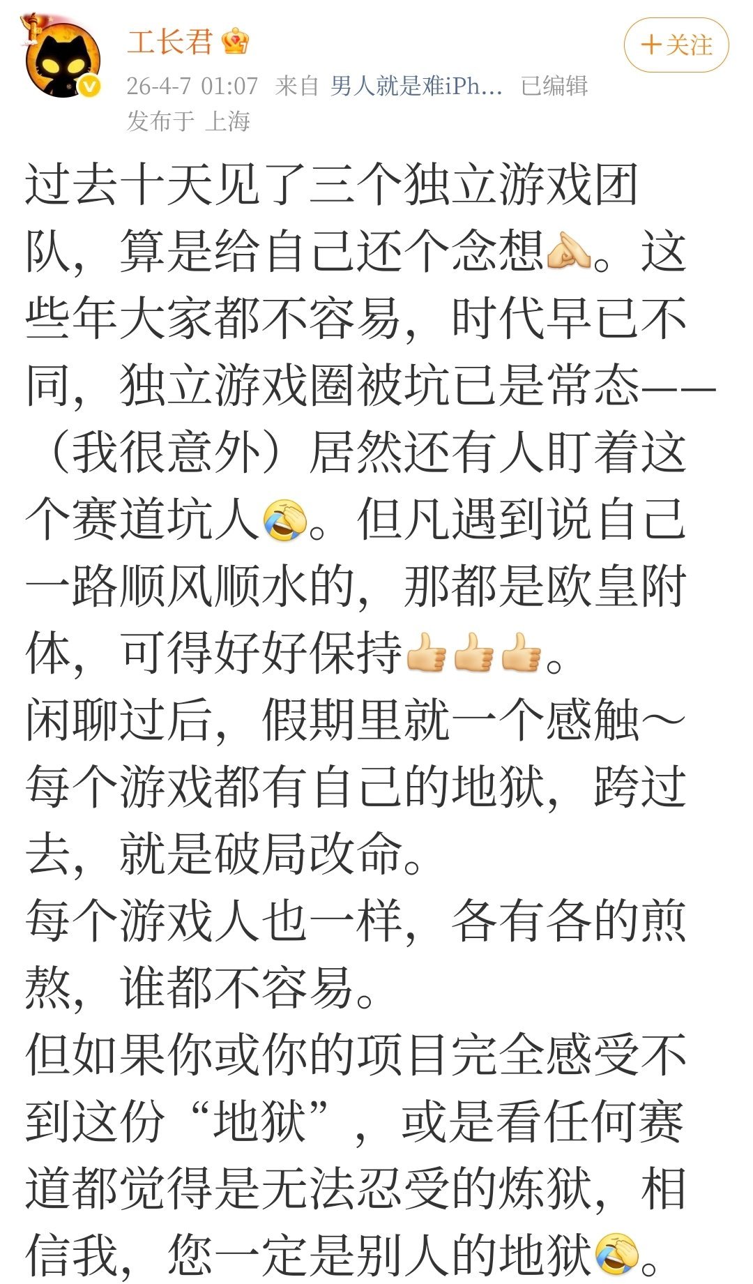 过去十天见了三个独立游戏团队,算是给自己还个念想。这些年大家都不容易,时代早已不同,独立游戏圈被坑已是常态一一(我很意外)居然还有人盯着这个赛道坑人。但凡遇到说自己一路顺风顺水的,那都是欧皇附体,可得好好保持,闲聊过后,假期里就一个感触:每个游戏都有自己的地狱,跨过去,就是破局改命。每个游戏人也一样,各有各的煎熬,谁都不容易。但如果你或你的项目完全感受不到这份“地狱”,或是看任何赛道都觉得是无法忍受的炼狱,相信我,您一定是别人的地狱!