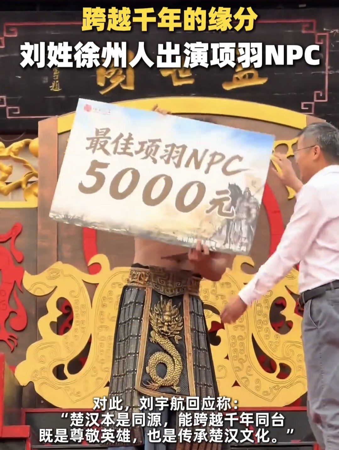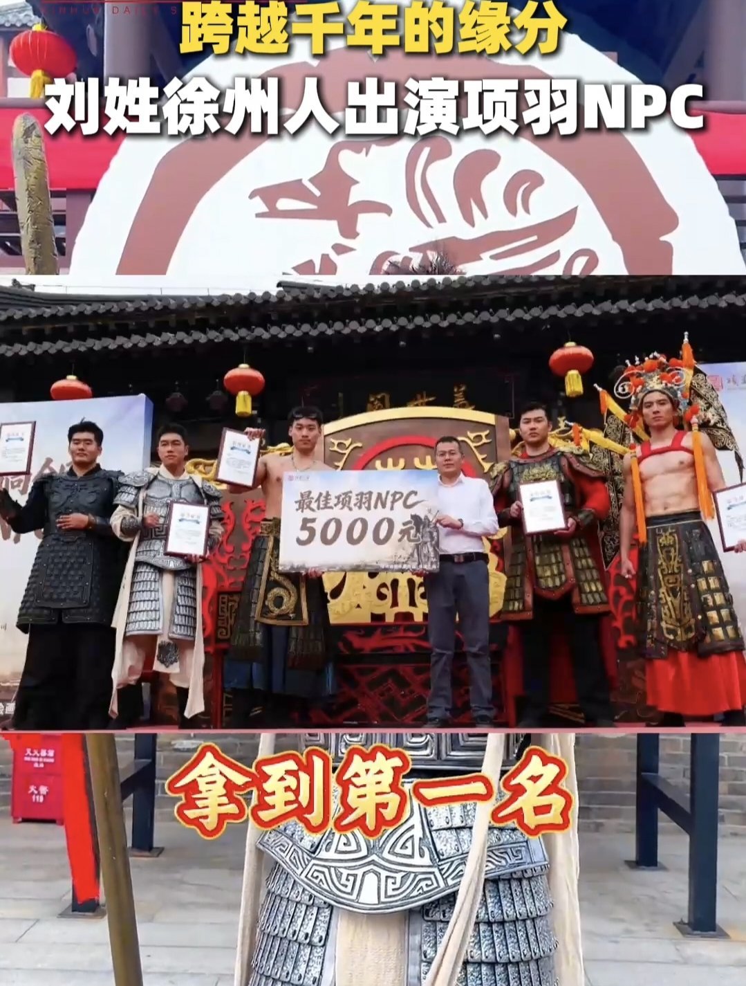 冠軍出爐:劉宇航,徐州人,身高接近2米。按公式算,日薪接近2000元,再加5000元冠軍獎金,清明三天假期收入相當可觀!他穿上霸王鎧甲後,氣場拉滿,符合“西楚霸王”形象。