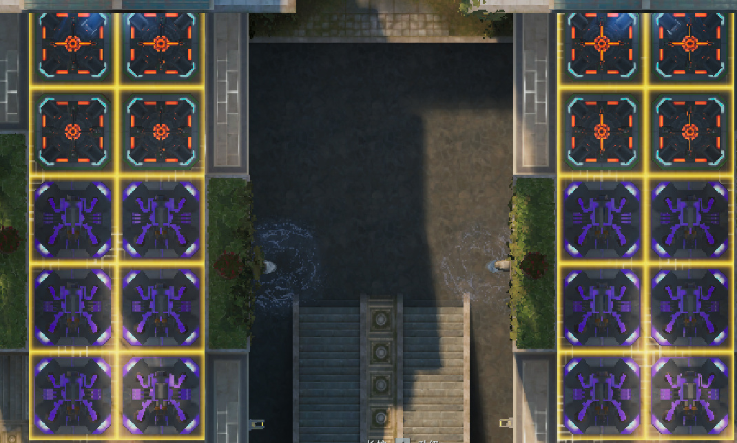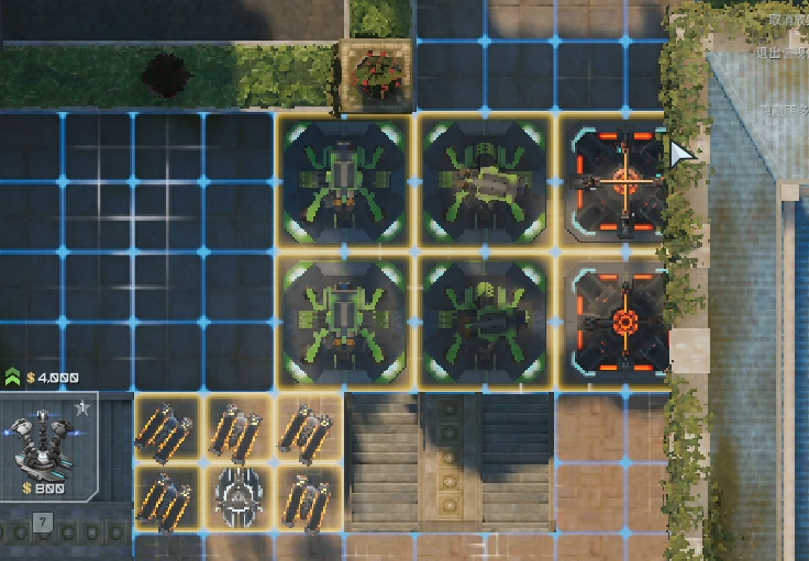 左右侧一样的,出怪口第一排四格空着,中间一排四格放自修,后面一排四格放歼灭者,并且歼灭者升到2级。
