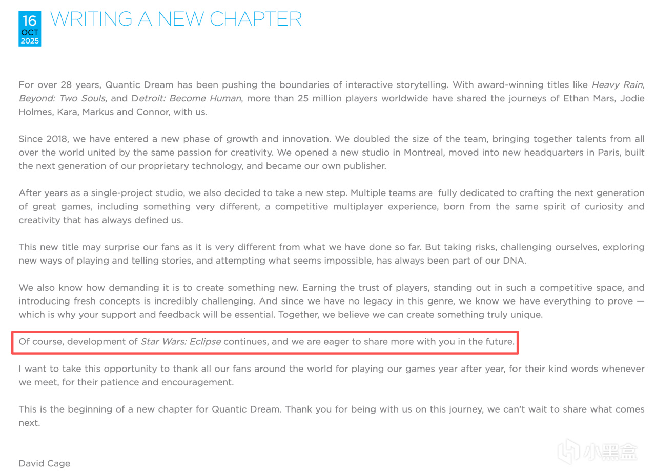 據外媒 Insider Gaming 報道,網易全資子公司 Quantic Dream 旗下新作《星球大戰:日蝕》開發進度緩慢。按照當前節奏,項目可能仍需數年時間才能完成。