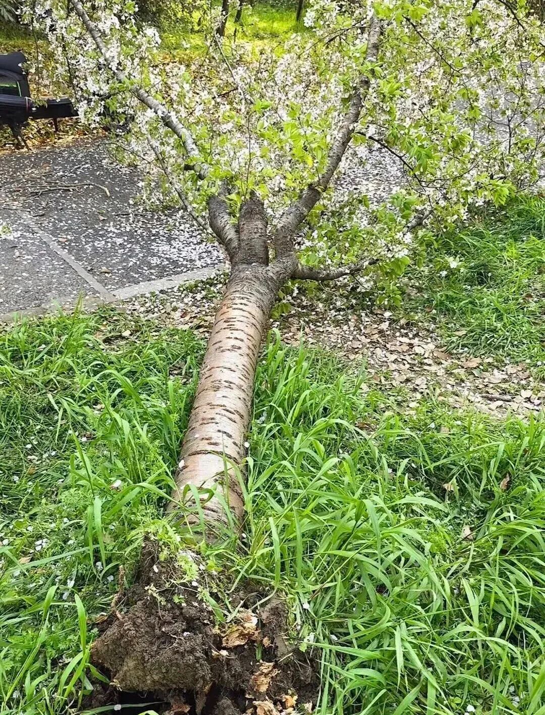 據園方確認,被壓塌的櫻花樹樹齡超20年,正值盛花期,根系完全斷裂,修復存活難度極大。事發後,養護人員第一時間將樹木扶正、修剪並加固支撐,全力搶救。