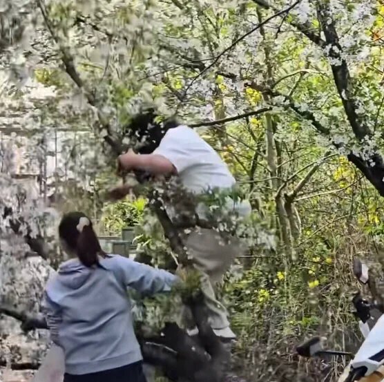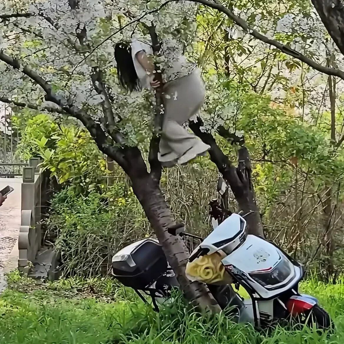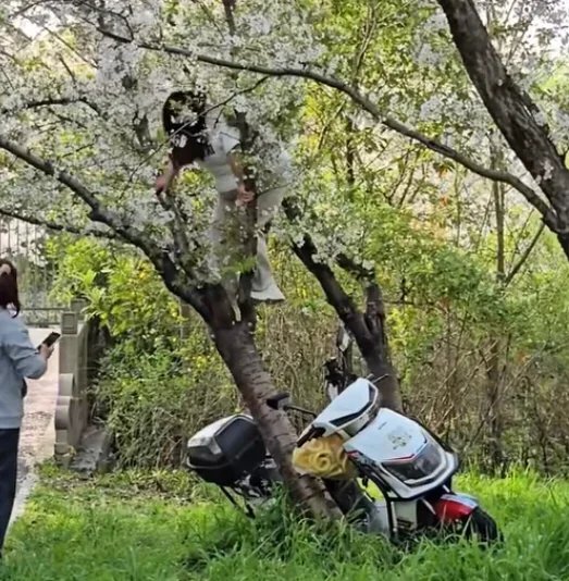 現場視頻顯示,事發時一名白衣女子爬上櫻花樹幹站立,同伴在樹下爲其遞手機調整拍攝角度。不料樹幹不堪重負,整棵樹連根拔起、轟然倒地,女子摔倒後未受傷,與同伴迅速騎電動車離開現場。