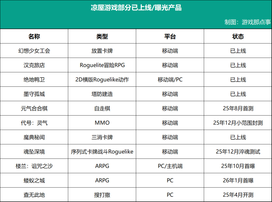 其他已上線產品方面,包括橫版動作肉鴿類的《絕地鴨衛》、水墨國風+塔防建造的《雀仔營地》,以及3D休閒動作RPG《漢克旅店》都屬於獨遊屬性較爲明顯的小體量單機。而仍在測試階段的像素MMO《代號:靈氣》與「元氣騎士」IP自走棋《元氣合合棋》,則可以看作涼屋在多人合作/對戰手遊方面的探索佈局。