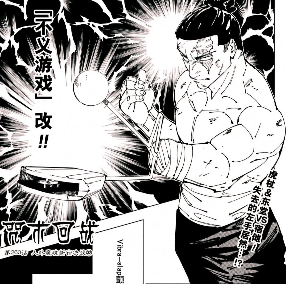 真人模仿五條悟短暫發動僅0.2秒的領域展開【自閉圓頓裏】,精準鎖定東堂葵。其左臂被真人術式重創。爲防止詛咒進一步侵蝕全身,他果斷自斷左臂,也因此永久失去了需雙手拍擊才能發動的術式“不義遊戲”。