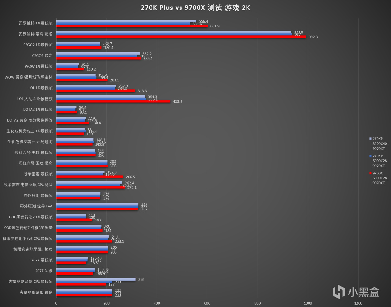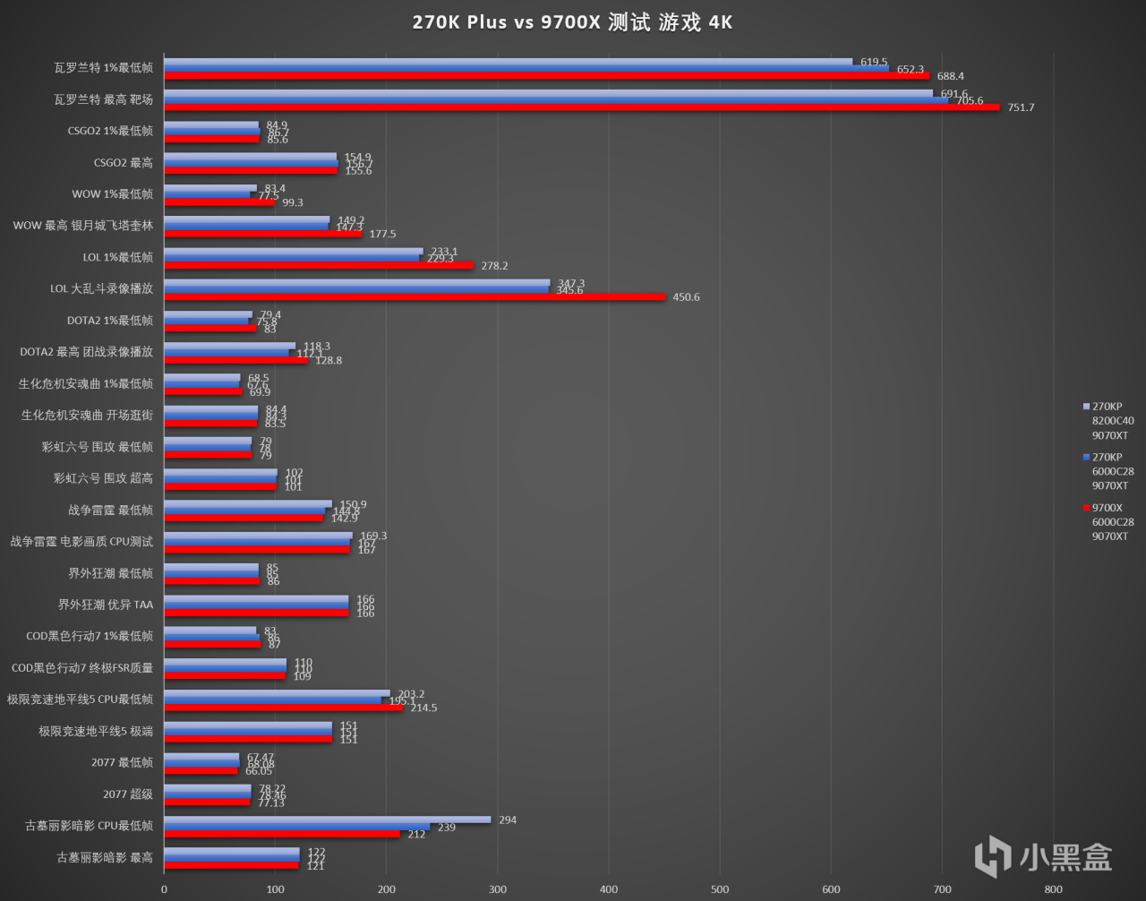 在主流的2K分辨率,差距進一步拉大了。可以看出在APO的優化下3A大作270KP的表現確實不錯,但是換到網遊,即便是在APO名單裏的遊戲表現也都不佳,更不要說名單之外的了,依然是被9700X壓制: