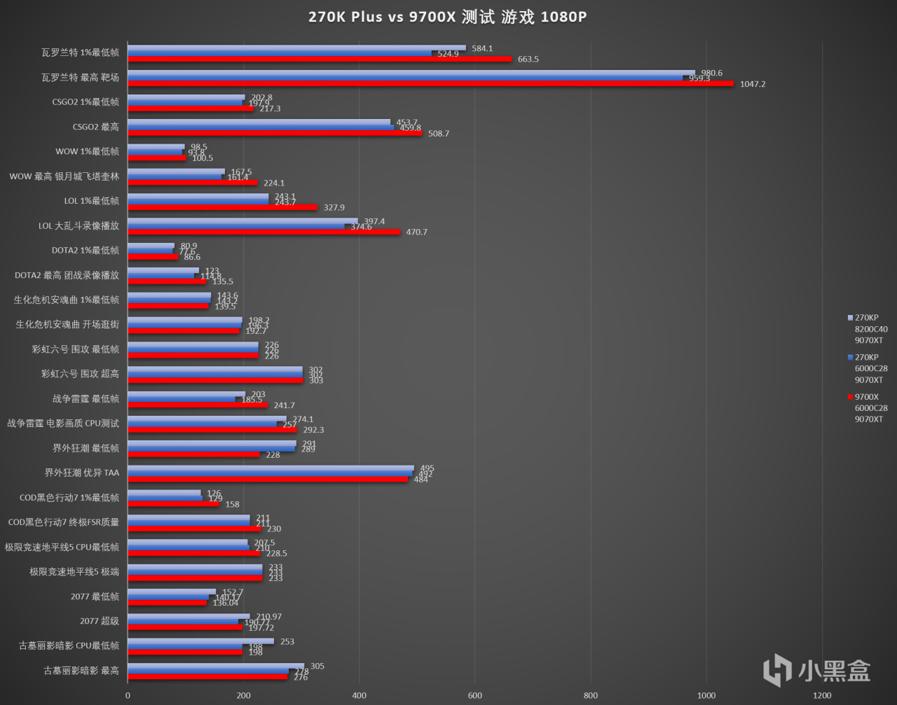 至於“電競分辨率”1080P下,那更是9700X的主場,甚至連3A都很難贏了,當然有些3A憑藉着8000高頻內存可以艱難地取勝,可是換到6000內存就攻守之勢逆轉了,網遊則基本上一邊倒,不論在不在APO名單裏的: