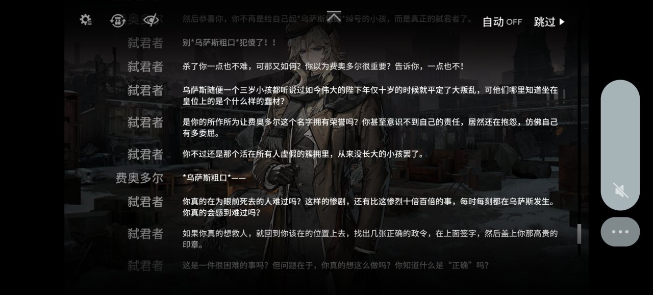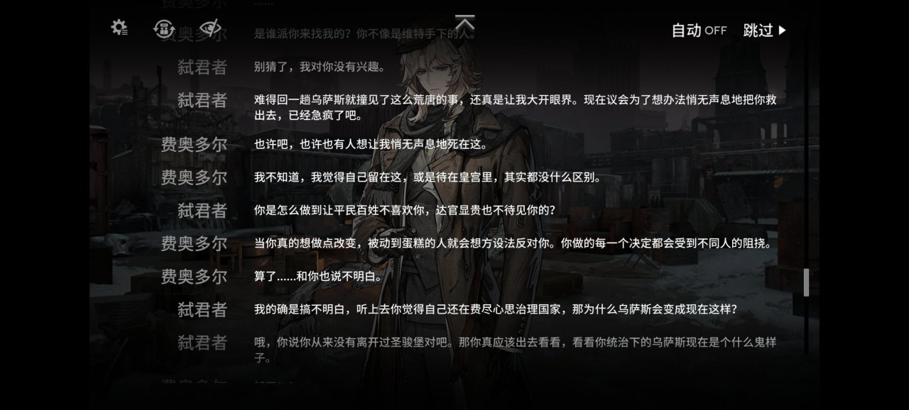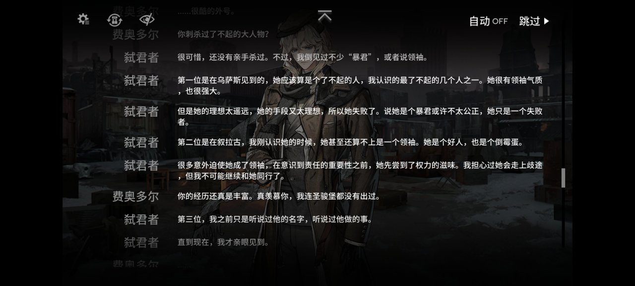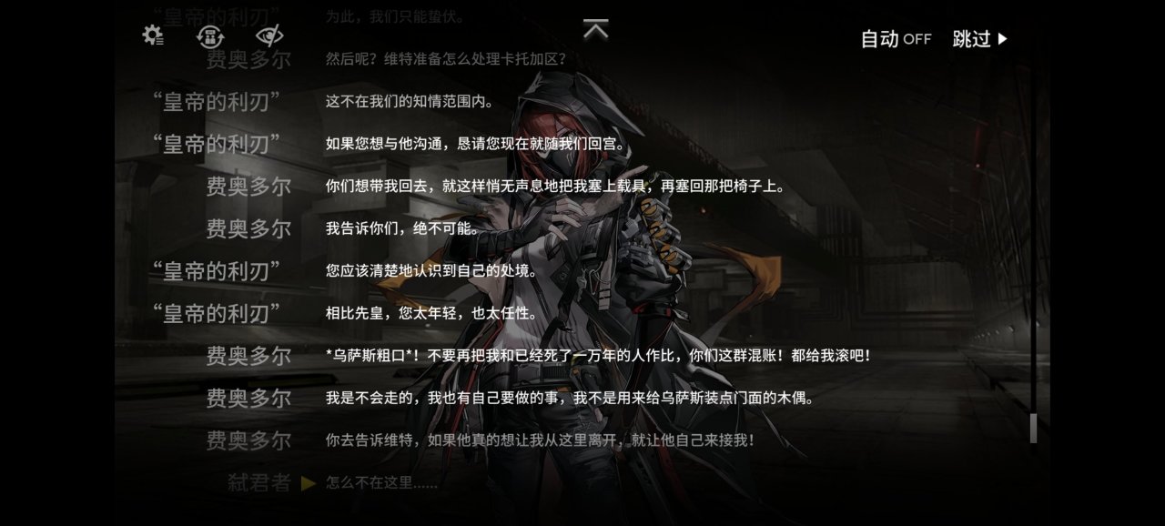 而弑君者则是接受了罗德岛的委托从本舰赶来处理博士的远古婴儿床问题,为了找到那个能复活凯尔希的石棺来到这里,却被卷入乌萨斯学生自治团的行动中。,这位刺客并不是第一次接触到君主这种大人物,但是却不是来杀他的。当然四周的内卫也不是吃素的,但是皇帝哥哥并不想回去做盖章大师