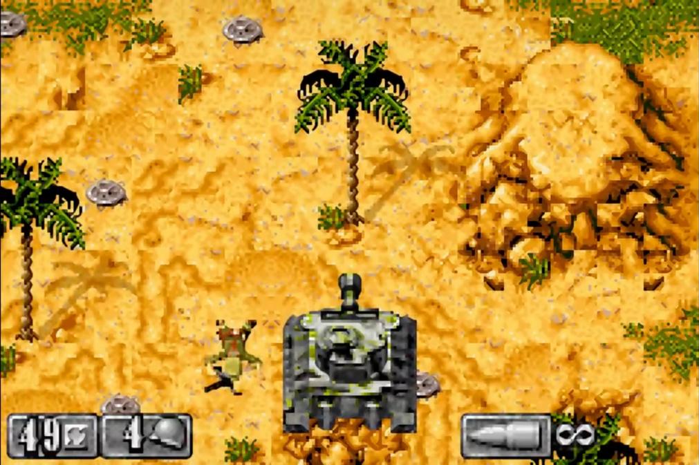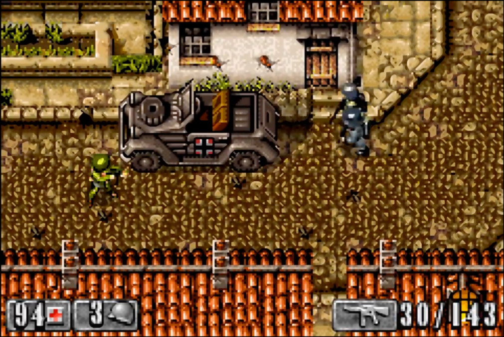 游戏中大部分关卡采用俯视角形式,你将使用多种武器,在场景中消灭敌人完成任务,整个流程中回复道具很少,加上主角武器弹药有限,想用魂斗罗那种爽快割草的方式过关非常困难,例如德军的MG42机枪,正面来上一梭子基本就挂了,后期还有用火箭筒的敌人,加上雨点般的手榴弹,正面硬扛非常困难,即使开着坦克也不能一股脑硬闯,更多需要依靠地形配合精准射击,关卡中敌人有较为固定的巡逻路线,还可以潜行绕到敌人背后暗杀,非常具有挑战性,另外受限于GBA掌机的十字键,玩家不能像现代游戏那样用摇杆360度全方向射击,也进一步提升了难度。