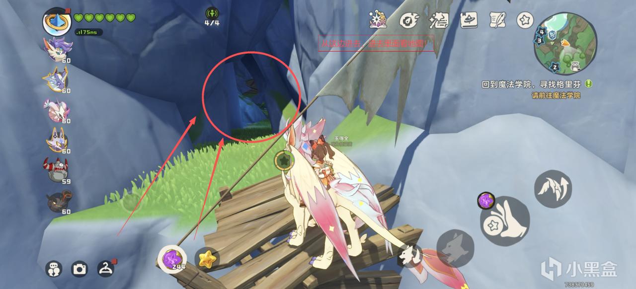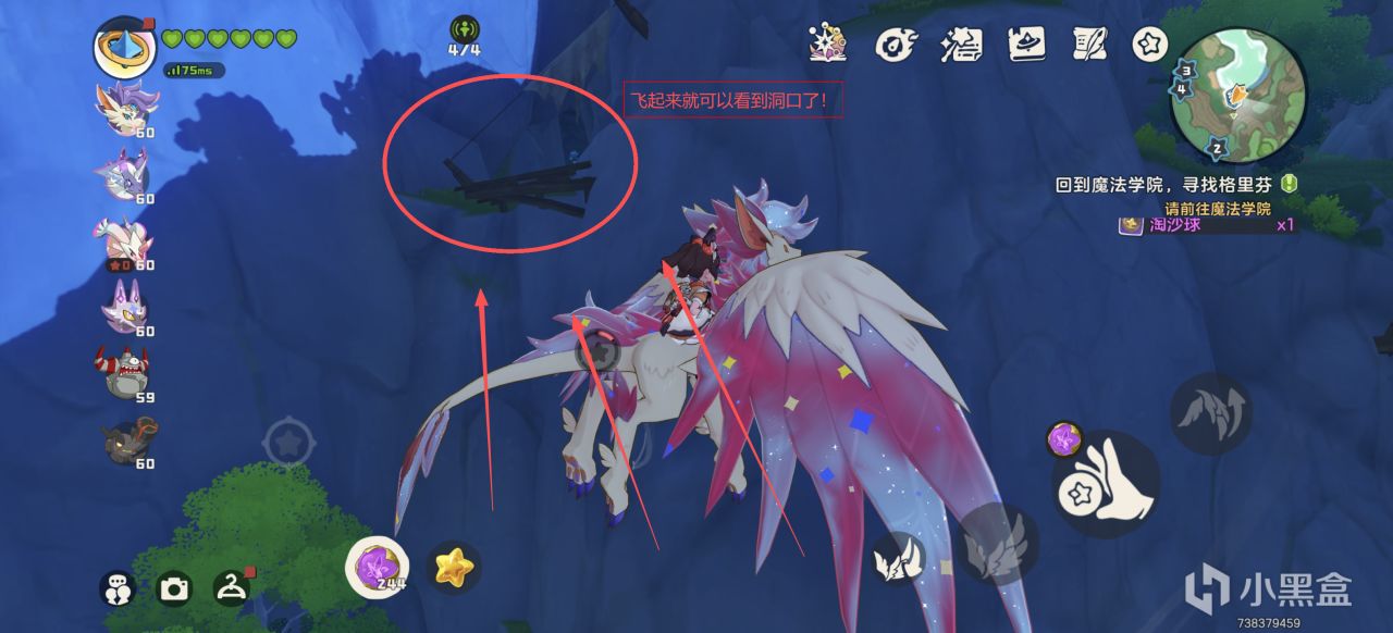 我就默认大伙都没解锁,统一从咕嘟咕嘟浅滩的魔力之源出发,我们传送过去以后,飞起来,抬头往左边看,就可以看到洞口!