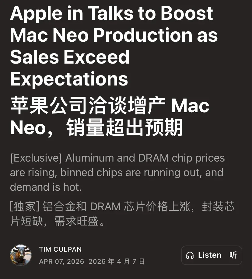 苹果正在与供应商谈判,以应对其 MacBook Neo 销量超出预期的巨大挑战