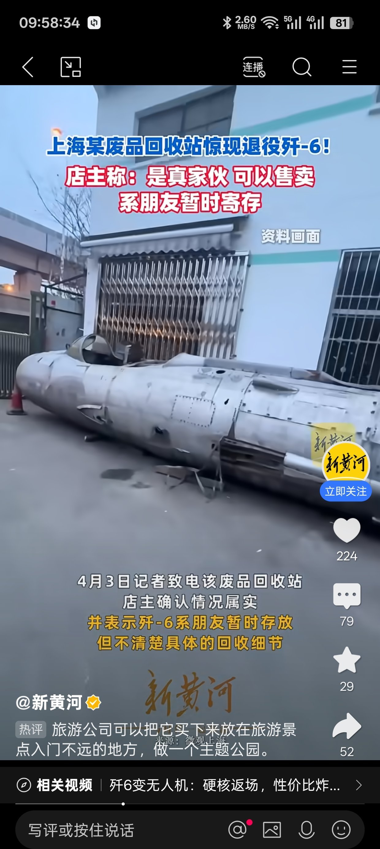 從現場畫面可見,這架戰機機身雖已老舊、部分結構破損,但整體輪廓、座艙等特徵清晰可辨,確爲我國自主研製的第一代超音速戰鬥機殲-6。4月3日,記者致電該廢品回收站,店主確認情況屬實,稱這架殲-6是朋友暫時寄存在此,且表示該戰機爲真傢伙、可以售賣,同時坦言自己不清楚具體的回收細節。
