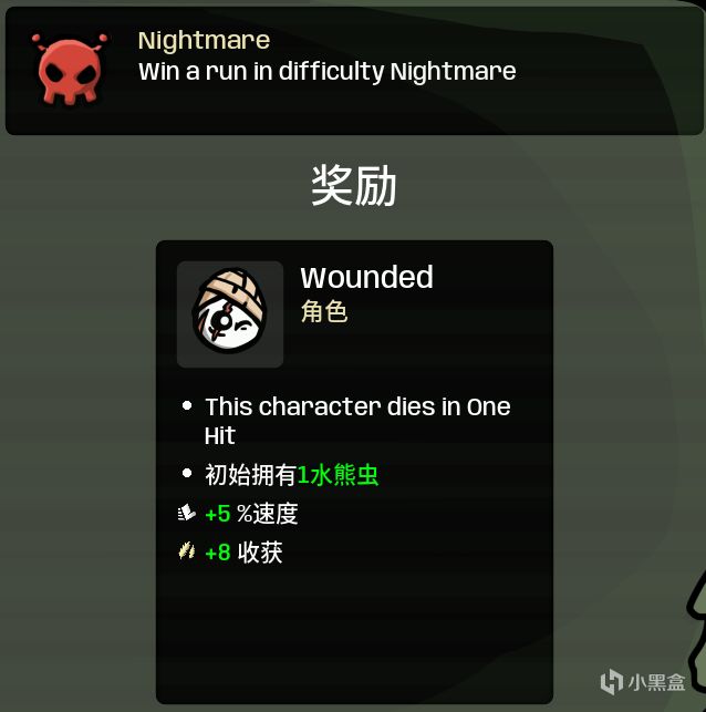 使用任意角色通關一次噩夢難度即可解鎖。該角色初始擁有更高的收穫和速度,但一碰就死!不過開局自帶一個“水熊蟲”,爲你提供一次容錯機會。