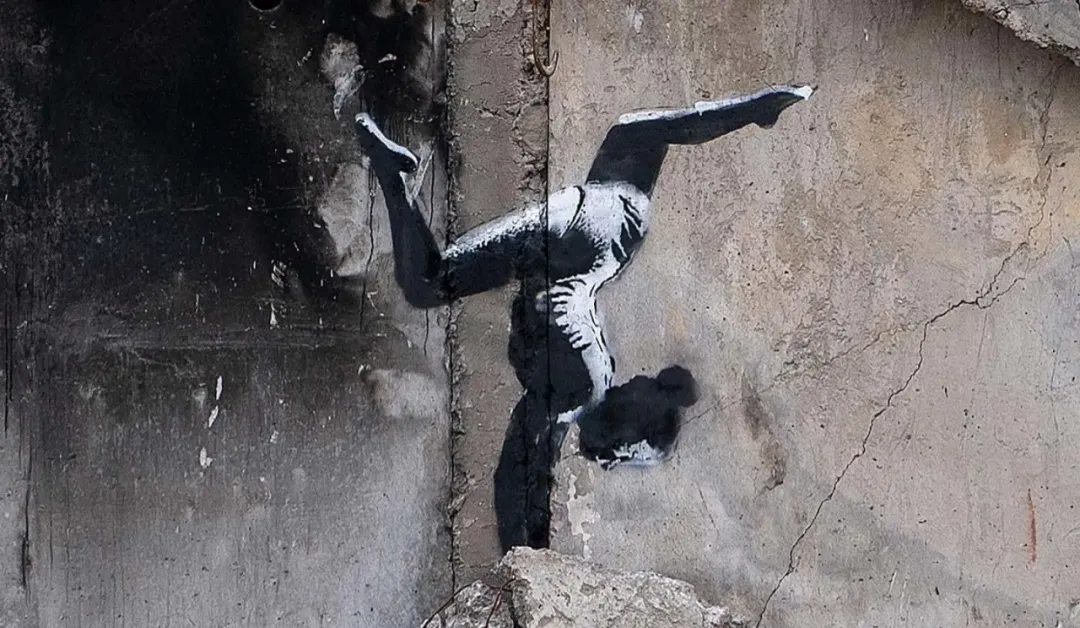 题材永远是反战、反消费、反权威,画风辨识度极高。他把壁画画进了约旦河西岸的隔离墙,2022年跑去乌克兰战区废墟上创作,2025年把法官殴打抗议者的画喷在了伦敦皇家法院的外墙上。