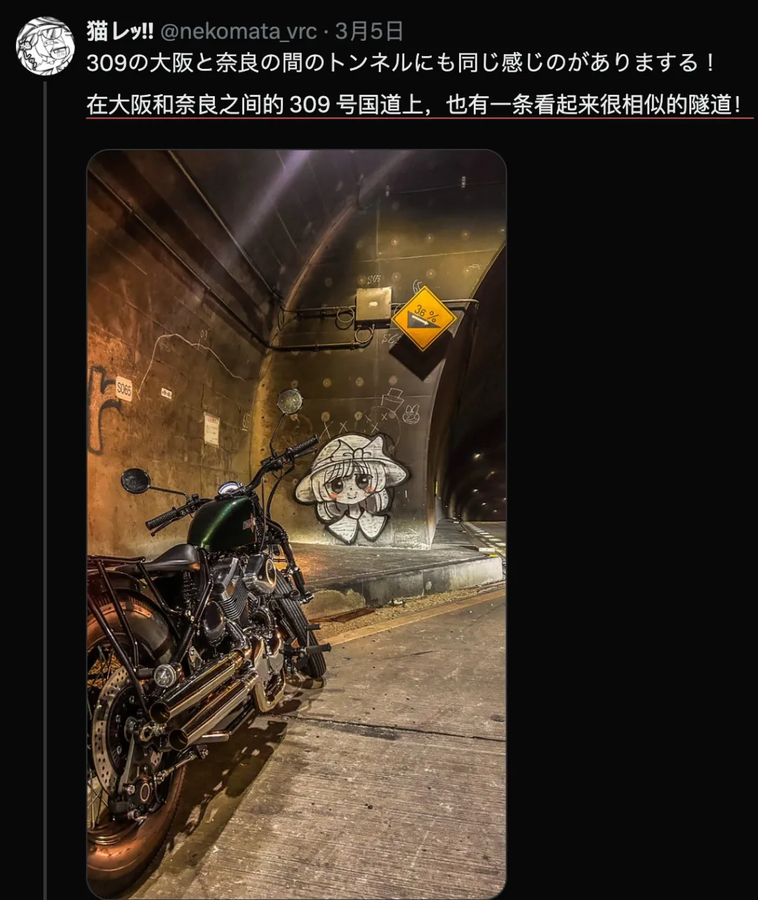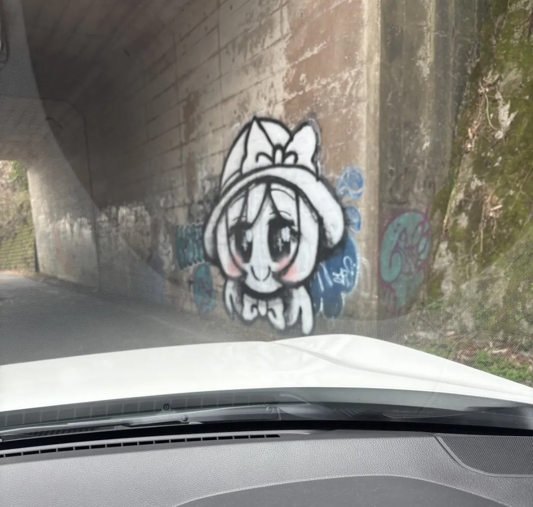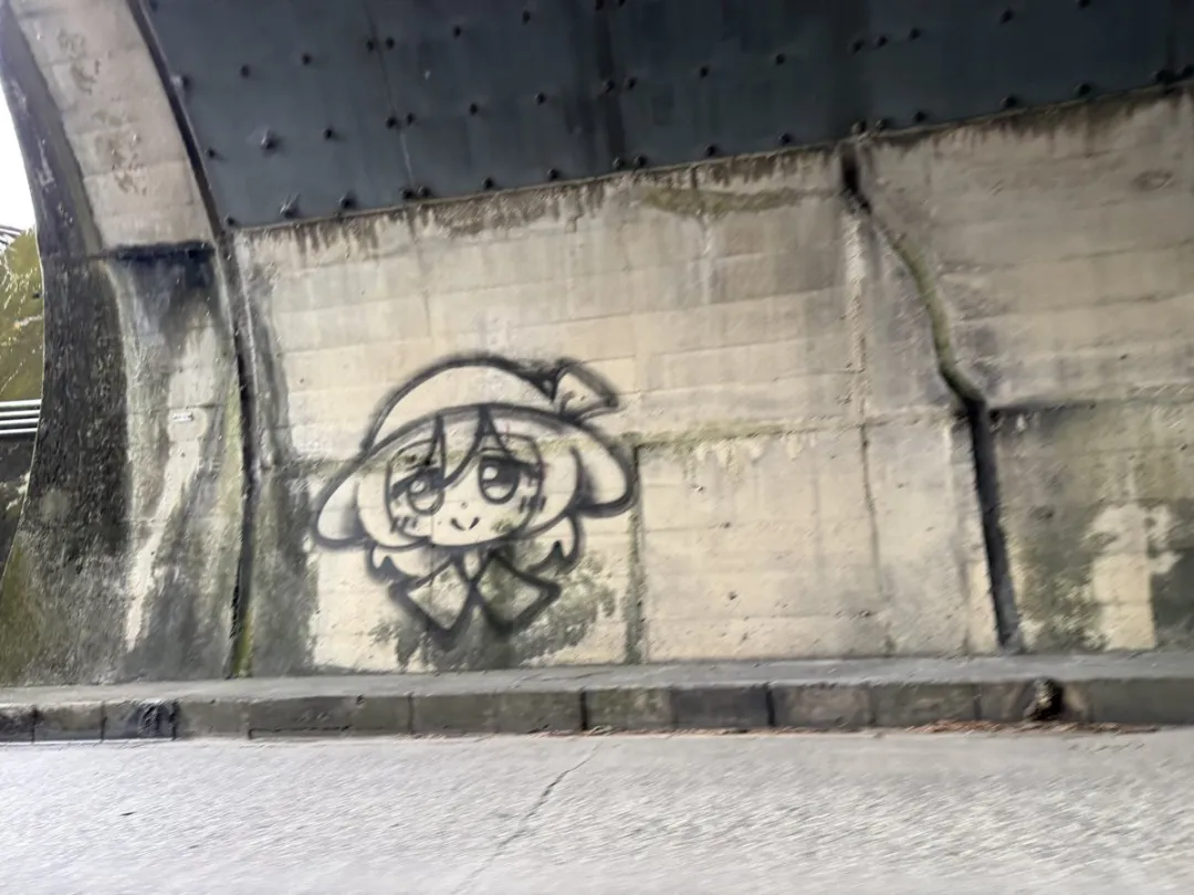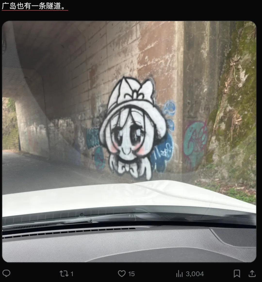 但除此之外,日本忽然各地都涌现出古明地恋的涂鸦,有人在奈良五条往十津川村方向的公路上也发现,168号国道、309号国道的山间隧道里也有,八尾有、大阪市内某路口有、广岛的隧道也有。