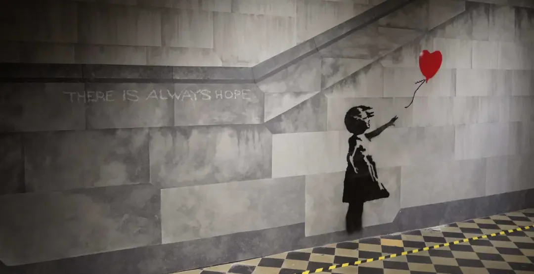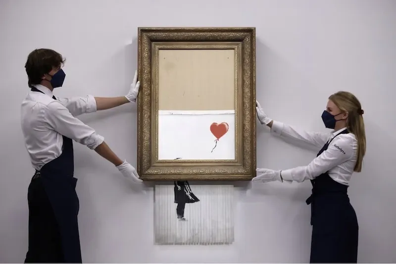 2018年,《带气球的女孩》拍卖落槌的瞬间,画框底部启动了他提前藏好的碎纸机,作品当场被切割一半,三年后更名《爱在垃圾桶里》再次拍卖,成交价约2500万美元。