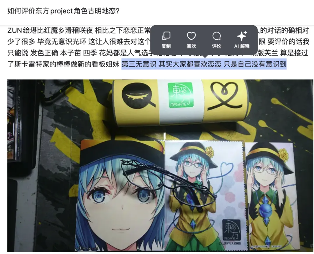 知乎东方讨论区有条经典高赞回答,说古明地恋受欢迎的第三个原因是“无意识——其实大家都喜欢恋恋,只是自己没有意识到”。