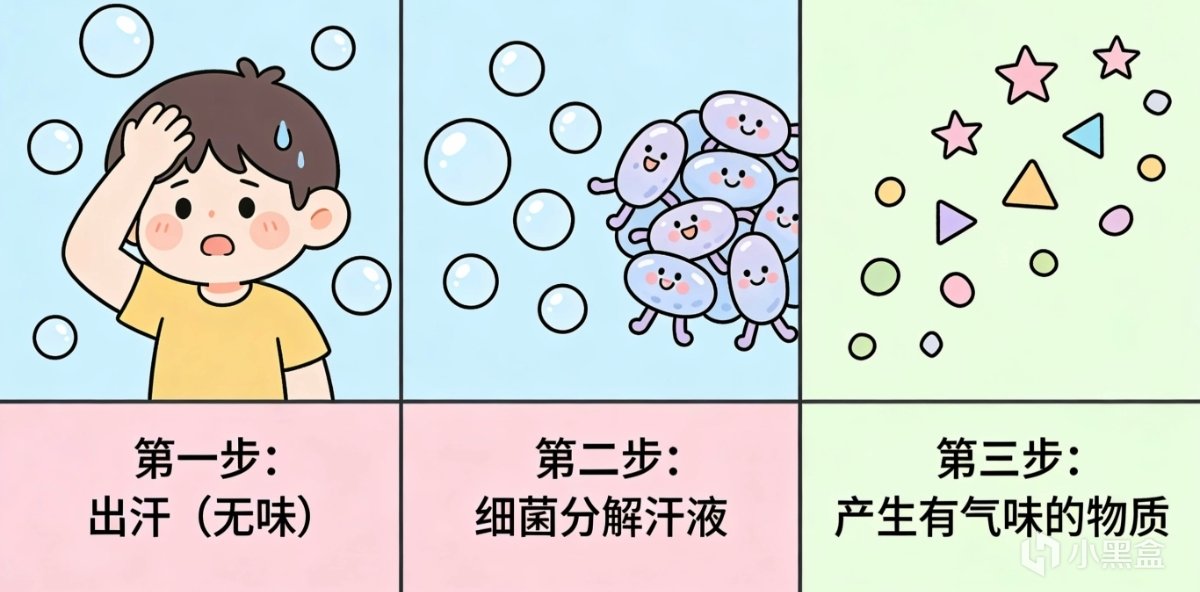汗本身沒有味道。汗裏90%以上是水,剩下的是一些鹽分和代謝物。味道的元兇是細菌。你身上有汗的地方,細菌就多。細菌分解汗液裏的蛋白質和脂肪酸,產生有味道的物質。腋下、腳、後背——這些地方汗腺多、不透氣,是細菌的“樂園”。所以,體味管理的核心不是“不出汗”,是“不讓汗被細菌分解”。