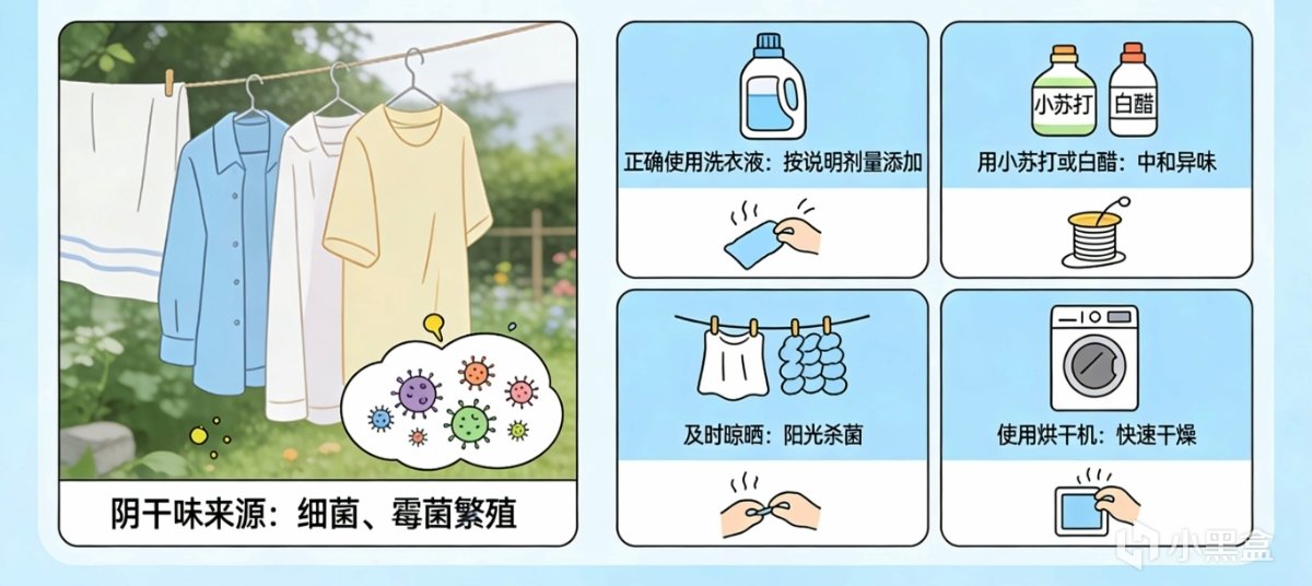 洗衣液別倒太少,也別太多。倒少了洗不乾淨,倒多了殘留。頑固汗味可以在洗衣時加一勺小蘇打或白醋。衣服洗完立刻晾,別在洗衣機裏悶着。有條件用烘乾機,高溫殺菌。如果衣服已經有陰乾味,重新用熱水加小蘇打泡一小時再洗。外套、毛衣不常洗,可以掛通風處,或者用衣物噴霧去味。