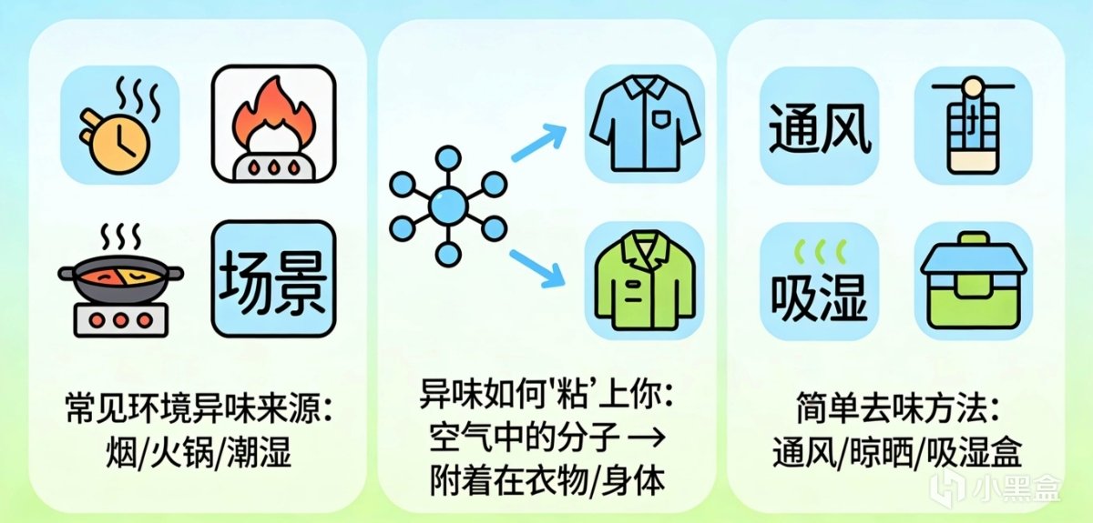 衣服上的煙味、火鍋味、黴味,都是環境給的。怎麼做?不在室內抽菸,抽完煙開窗通風。喫完火鍋、燒烤,外套掛陽臺散味。定期開窗換氣,別整天關着窗。衣櫃裏放吸溼盒、香皂,防潮防黴。