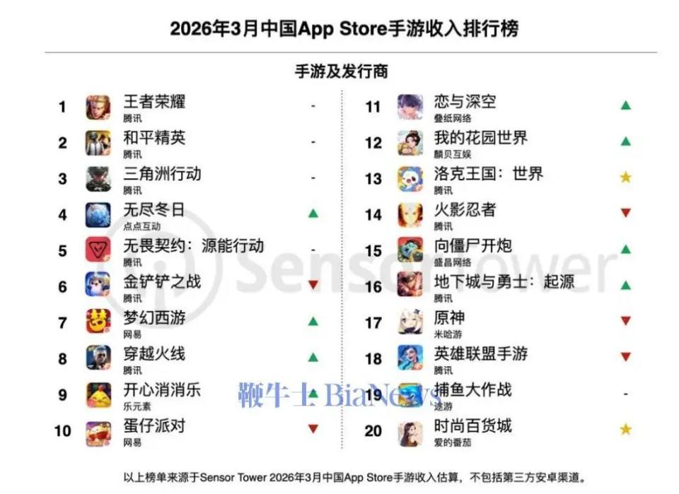 2026年3月中國手遊收入榜出爐:騰訊包攬前三,王者穩居榜首