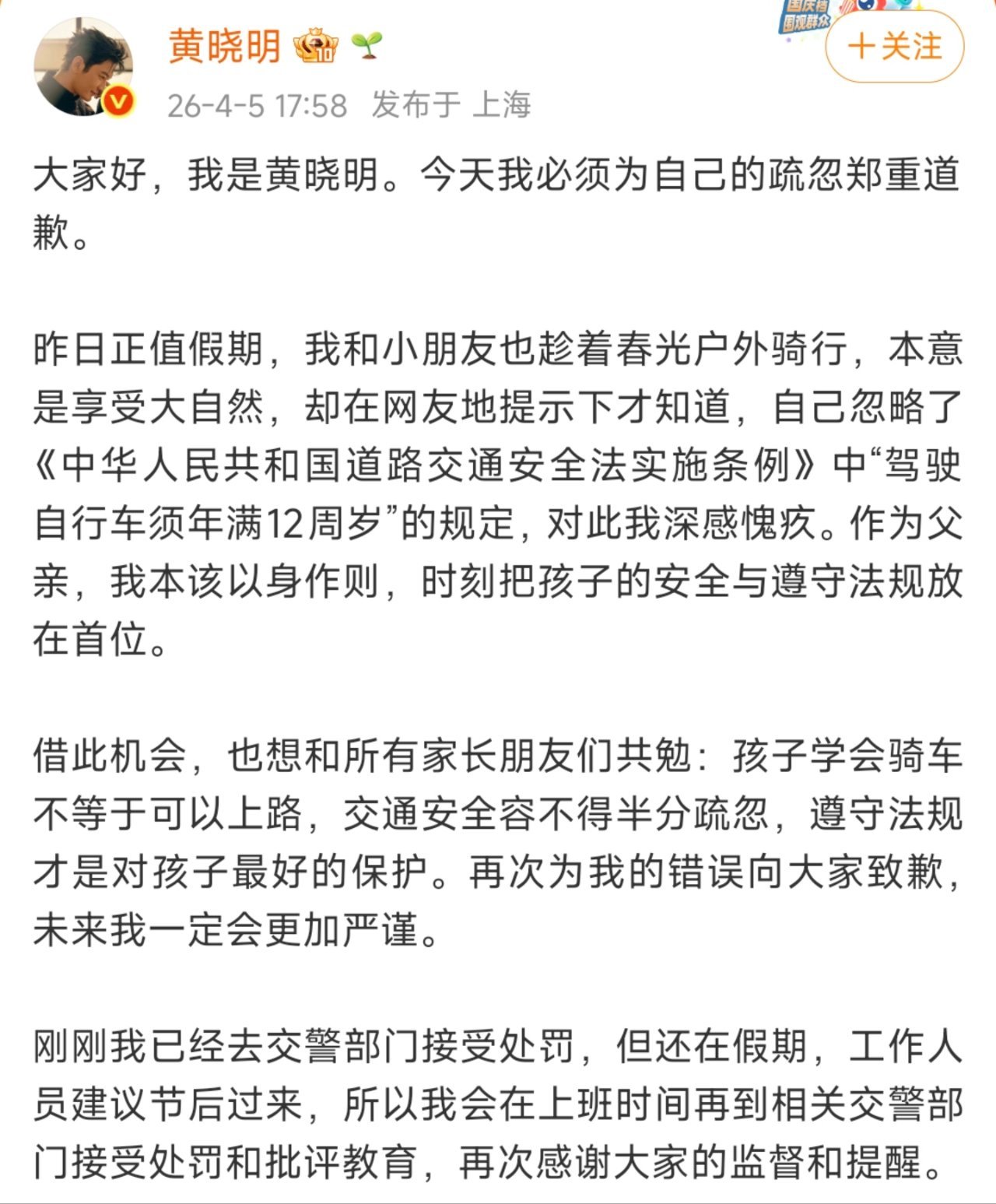 爭議發酵後黃曉明 3 小時內刪除爭議微博並於 4 月 5 日發文致歉,坦承自身疏忽強調 “孩子學會騎車不等於可上路,交通安全容不得半分疏忽”,同時承諾接受處罰。他當日即前往交警部門,因清明假期暫未辦理,答覆節後補辦。