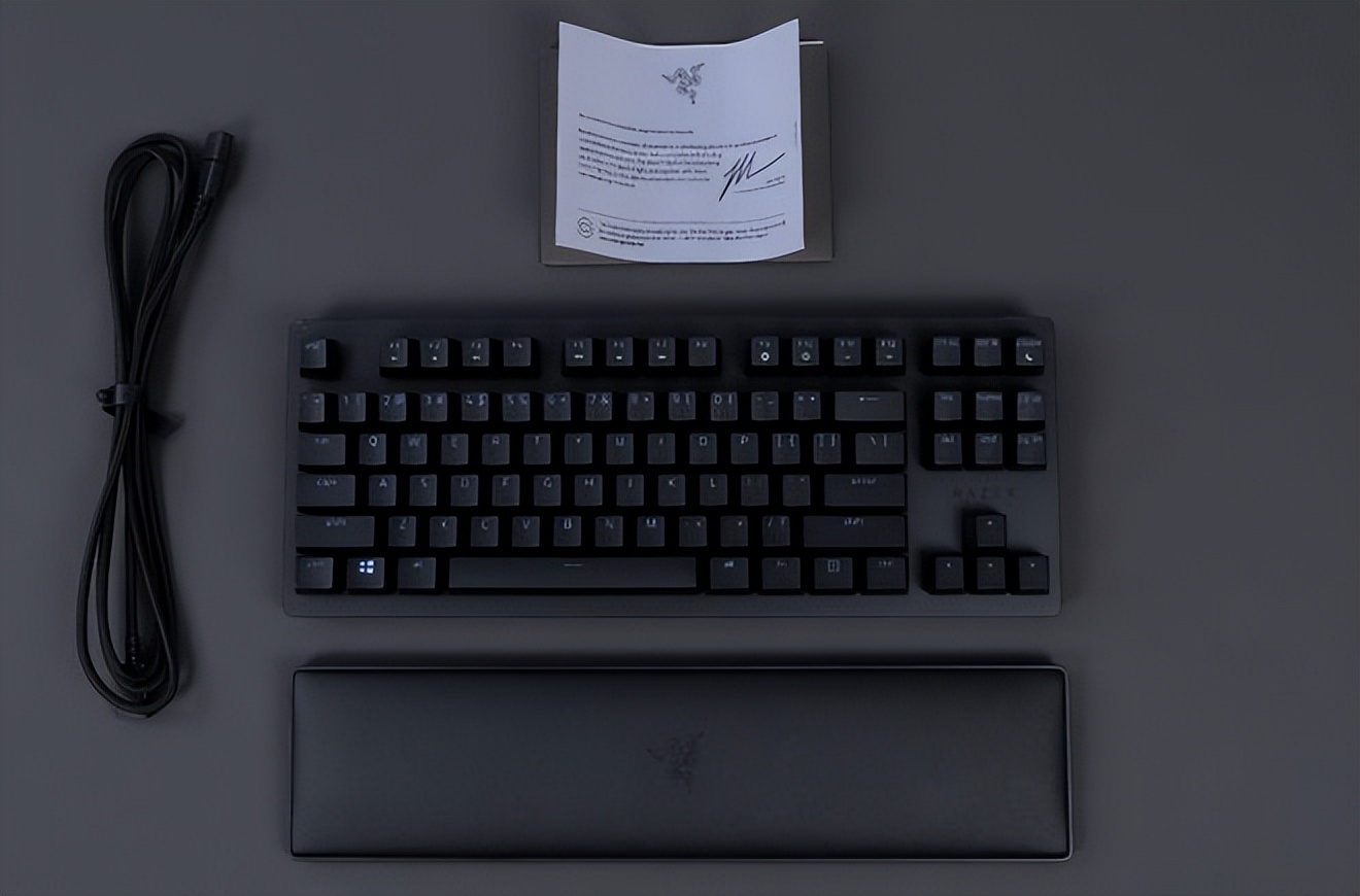 雷蛇一貫主題色的精緻外包裝,因爲沒有數字鍵,包裝的尺寸也小了很多。從外面就能夠一眼看出,鍵盤是默認附帶手託,這點很贊,省的自己去配一個的繁瑣。