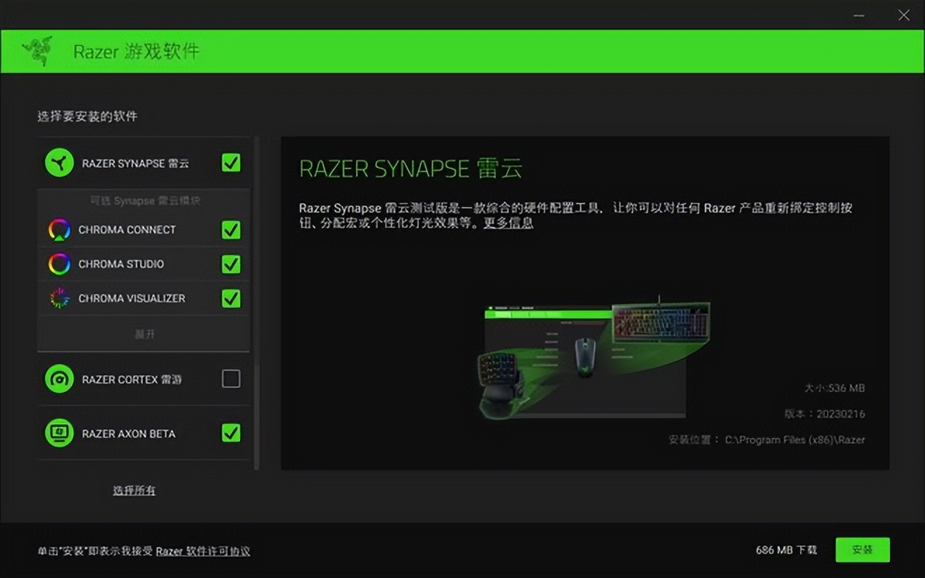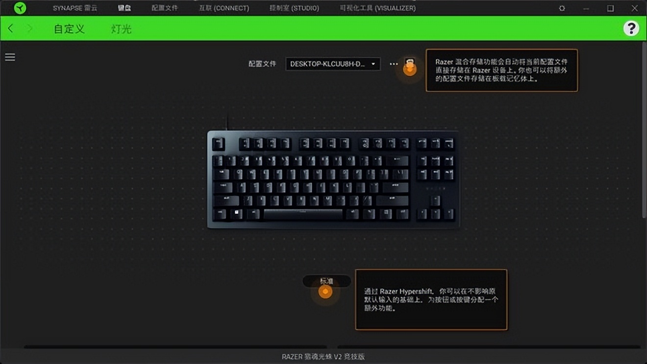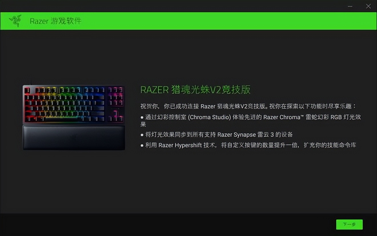 接入鍵盤後,系統就會自動提示安裝Razer遊戲軟件,安裝完成就可以識別當前的鍵盤型號,開啓完全體的Rzaer獵魂光蛛競技版使用。