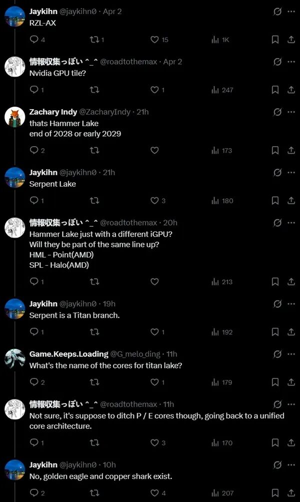 據Jaykihn透露,Intel Serpent Lake SoC將成爲首款集成NVIDIA RTX GPU的Intel處理器,同時下一代P核架構代號"Copper Shark"也被一併曝光。按照Intel目前的路線圖,Razer Lake將是Nova Lake的繼任者,預計2027-2028年推出,而Titan Lake緊隨其後,Hammer Lake則排在更後面,整體時間線指向2028年及以後。Serpent Lake將是Titan Lake CPU的一個分支,採用類似Halo的SoC設計方案。