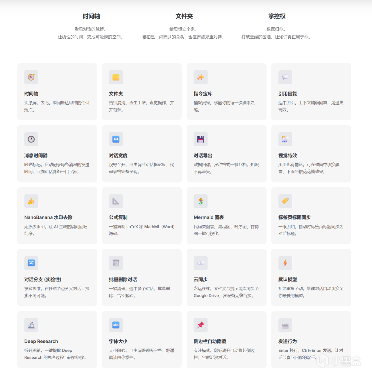 這款插件不搞花裏胡哨的冗餘功能,每一個設計都直擊用戶痛點:時間軸讓對話跳轉像“飛”一樣快,文件夾讓雜亂對話井井有條,靈感庫珍藏每一個神來之筆,還有無損去水印、公式複製、聊天導出等實用功能,重新定義AI交互體驗。