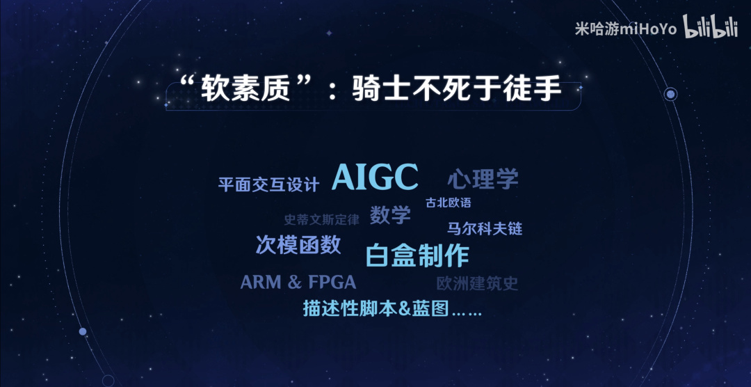 其中,關於學科背景,雞哥引用了“騎士不死於徒手”的概念,去講創作環節可能會運用到來自任何領域的學識;對於硬技能的需求,以“從扎馬步開始練起”去講技能學習、團隊磨合。