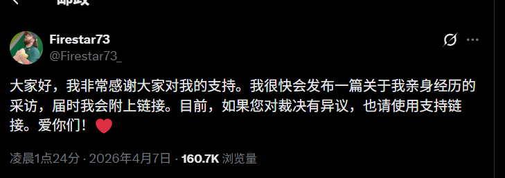 而此次事件的主角,我们的Firestar73也在其个人推特账号上发声,呼吁网友对他的支持。对于多年来终于见到的成绩被这样夺走,显然他也是难以接受的,
