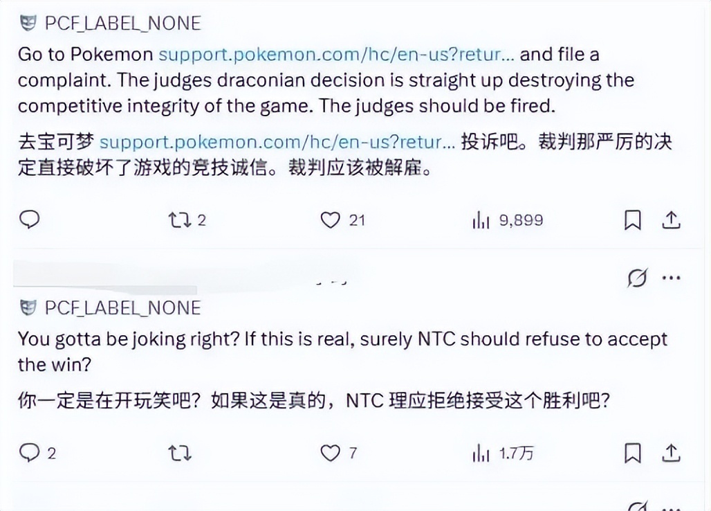 根据宝可梦官方竞技手册,“违反体育精神”这一条界定的十分模糊。只是明确了迟到、流程错误等行为可处罚,对于庆祝类行为并无具体细则规定,很大程度上完全依赖裁判的自由裁量。但别忘了前面提到的爆料哦,现场裁判都不觉得有问题。只能说如果爆料完全准确无误,那这里面可是就很有门道了。不过我们看现场视频,一旁裁判的反应确实不像是有意见。目前,国外网友们已经炸了锅,纷纷声援Firestar73,并且向宝可梦官方投诉此次事件的判罚。