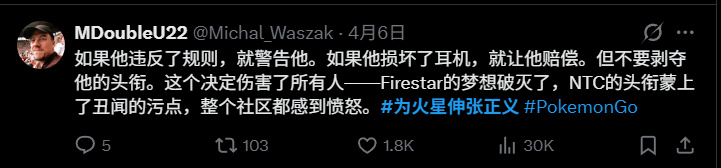 而主办方抓住的攻击点是认为他在起身瞬间放下耳机的动作不正常,认为他“摔了”耳机,影响了选手——然而大伙儿看到的只有一个人在获得如此艰难的胜利时,抱着极度喜悦兴奋的心情快速放下耳机的动作而已。而且他全程没有冲向对手挑衅,没有辱骂裁判,甚至在站起举拳庆贺后,第一时间就去和对手握手。然而更重要的是同样在宝可梦go赛事上,别的选手获胜时做出同样的动作,却根本没有耽误人家拿冠军。