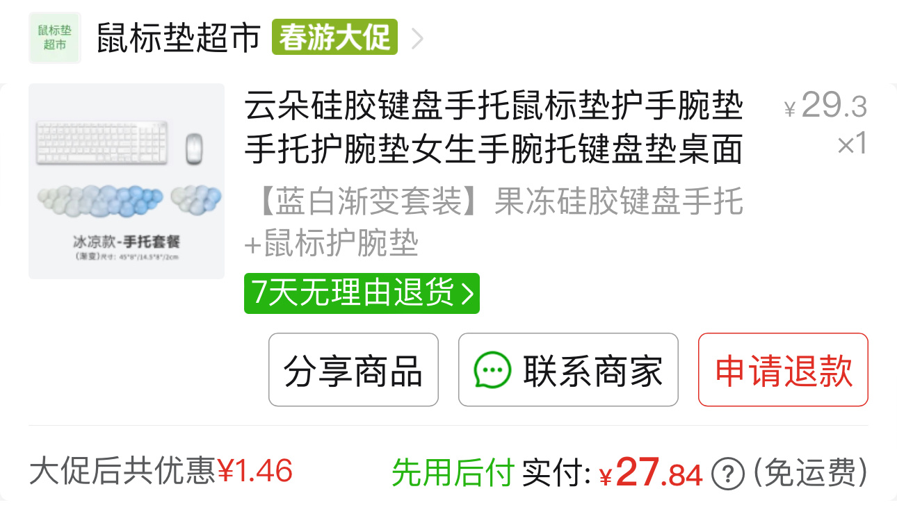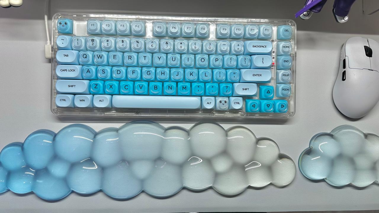 就是上面圖上這個,冰冰涼的,適合夏天,觸感QQ彈彈有點像果凍,可能有些人會覺得有點累贅影響打遊戲,但是我大部分時間玩遊戲都是手柄,鍵盤用來打字比較多,用了這個打字手腕輕鬆很多,而且配色我真的很喜歡,和我的鍵盤很搭!