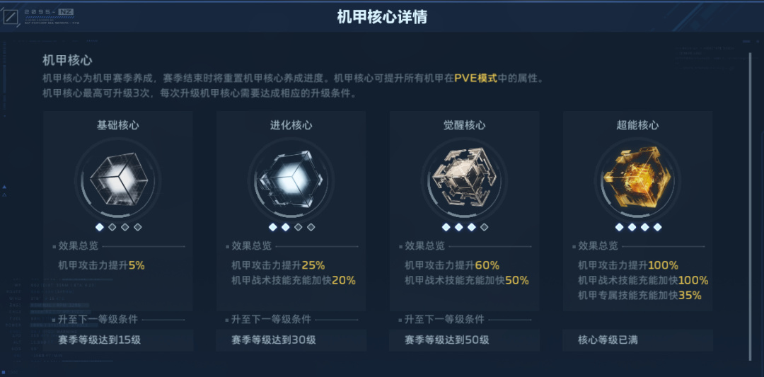 还有机甲,可能很多人已经习惯了,以为机甲PVE强度是天生的。实际上你需要到50级才能解锁全部的机甲buff,也就是现在打冰点、时空追猎会很头疼。